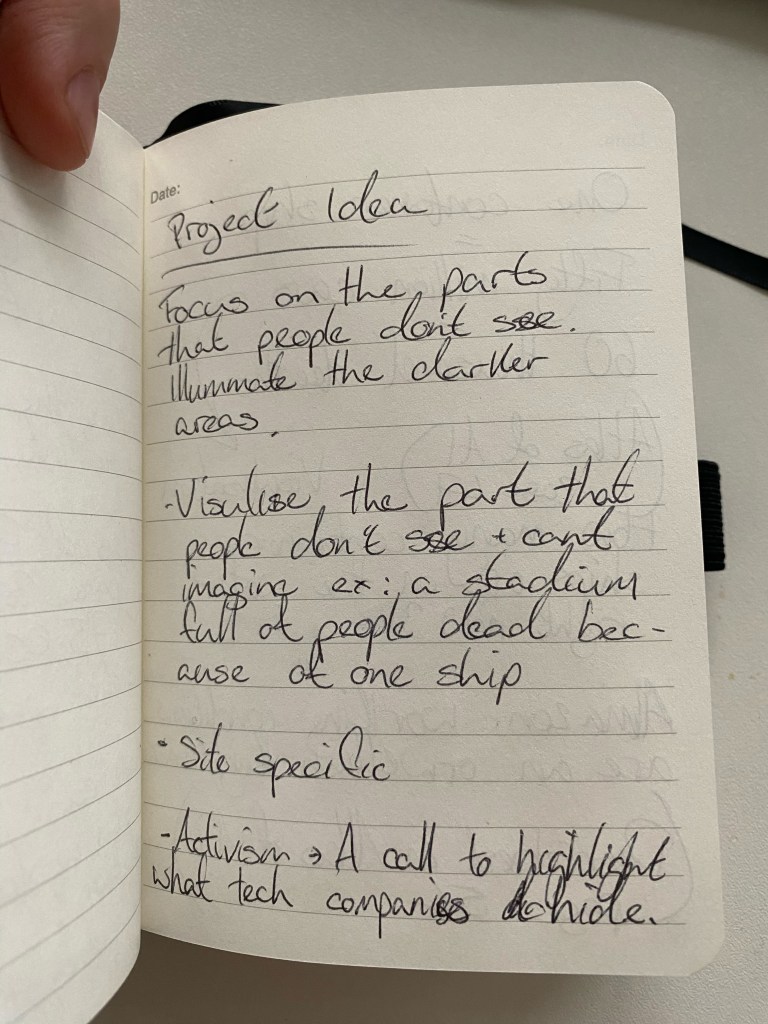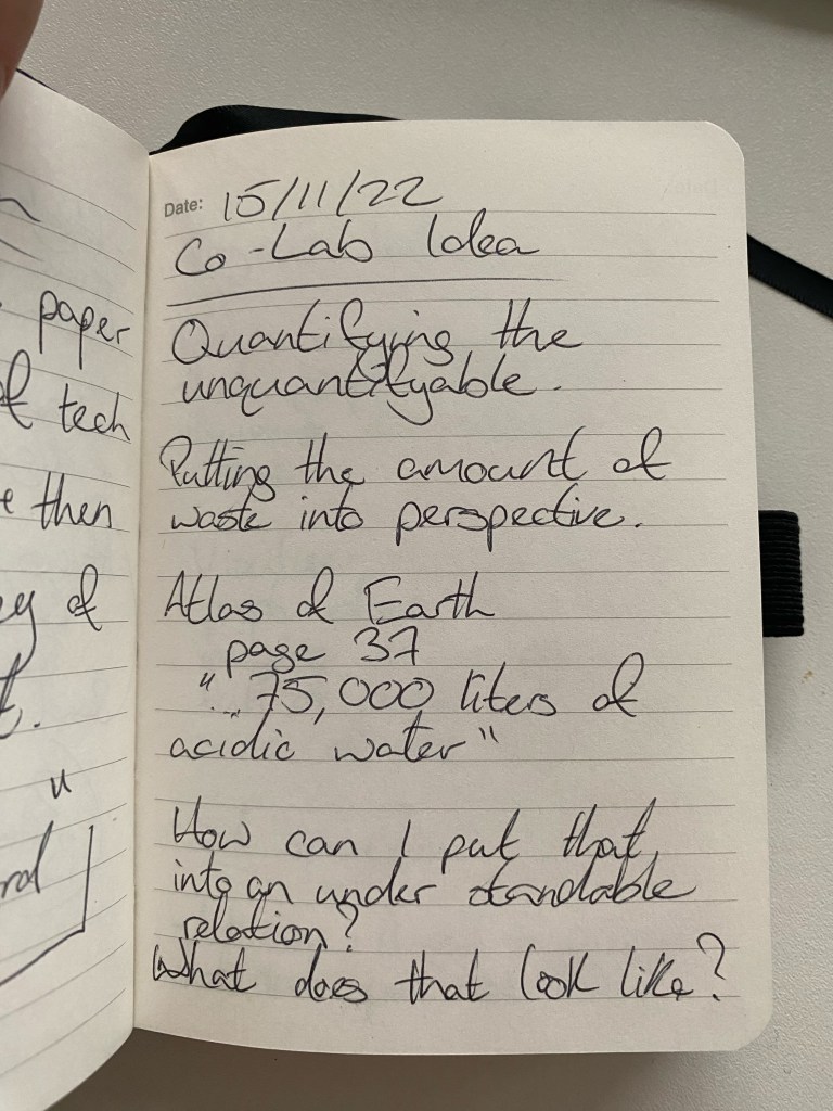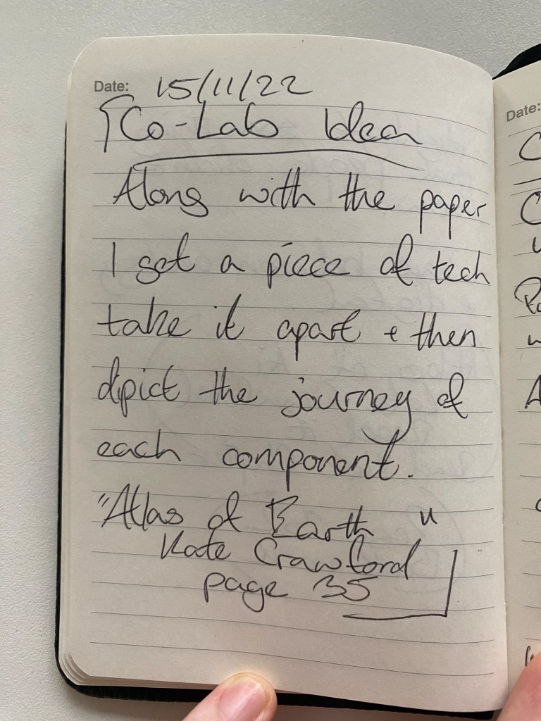 At the point of this note, I was still determining how to explore the relationship between the Anthropocene and my discipline and how I could personalise the tech we use and educate people on the process those materials go through before they get to us.