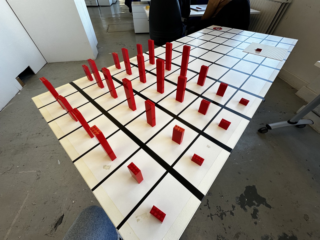 My plan was Initially to look at each Lego piece as a singular unit. Still, again, when discussing with Paul, there might be too many Lego pieces or something that will not fit into my time frame, so with the eight Lego studs on each block, that will represent eight men.