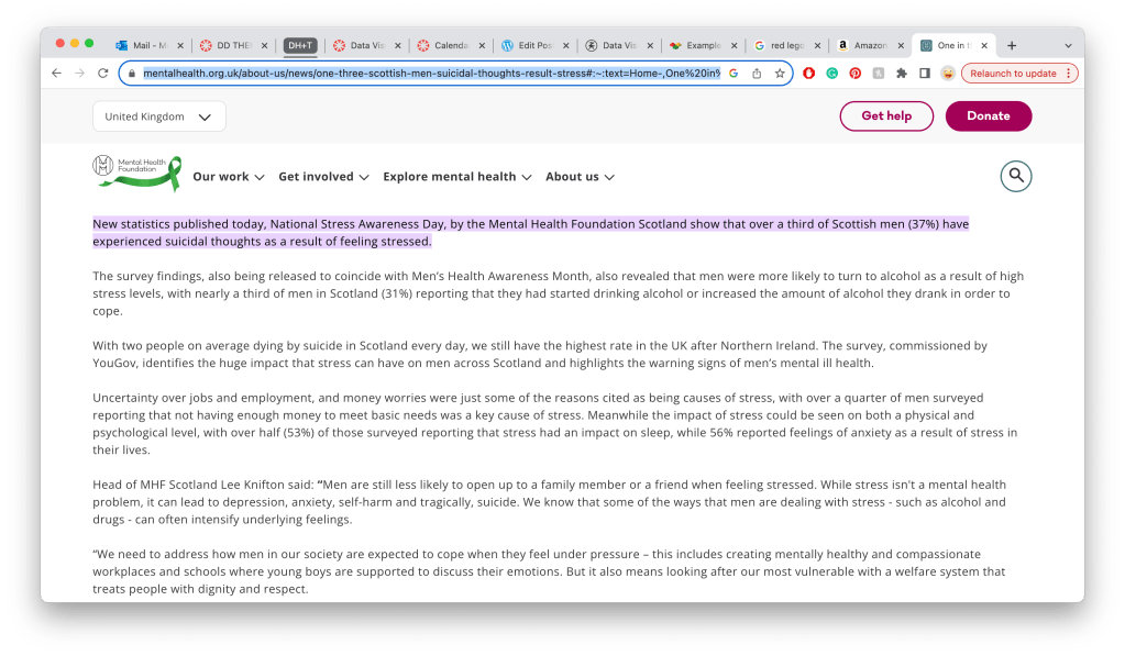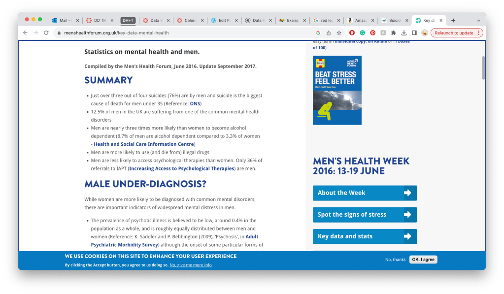 The belt was a concept I had for Data Visualisation that initially was just an idea on how to show data physically, something personal by proximity. Data that can be worn. But through my life and the discussion of men’s mental health that has been happening more and more in society, I thought it would be an excellent opportunity to use my data to bring more attention to it, but as I’ve been working through the concept, I feel that at this point I can’t do it justice as well as the fact as that I am not finding the data and designing around it but starting with a concept and trying to cram the data in to fix it and the outcome won’t be good enough for myself or the cause I’m trying to help.