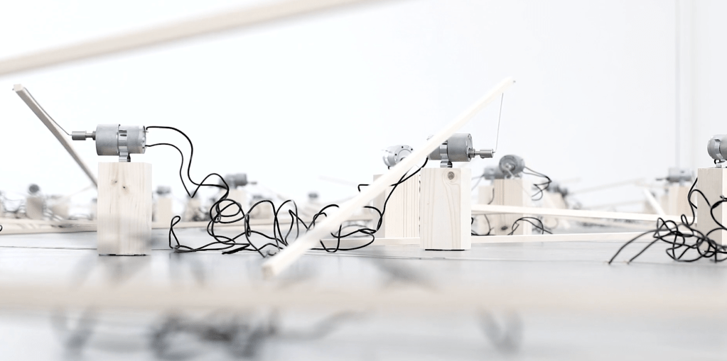 A large exhibition that has arms connected to motors and spaces for keys so that users to connect their keys, everyones keys will sound differently so when there is a large collection of them there will be a similiar effect to the work of Zimoun.
