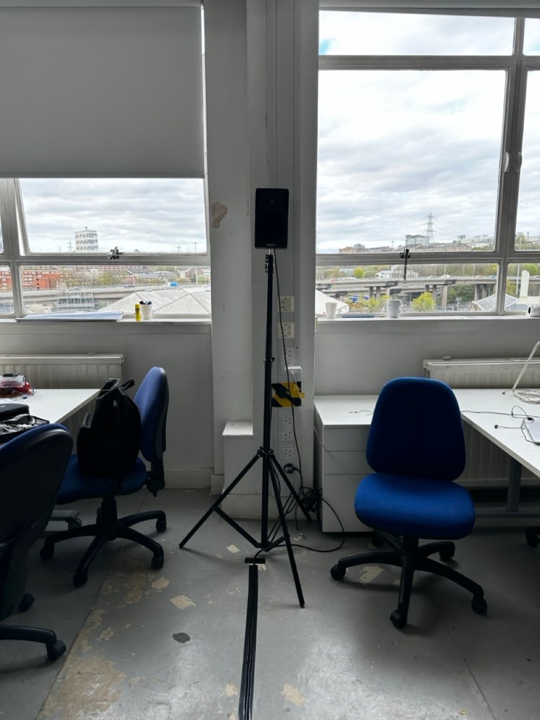 The set up is very minimal as to not distract from the audio and for the sound to be the main attractor.