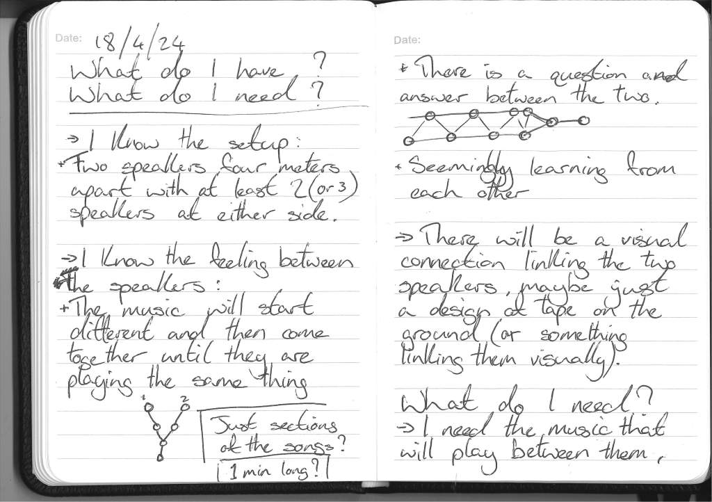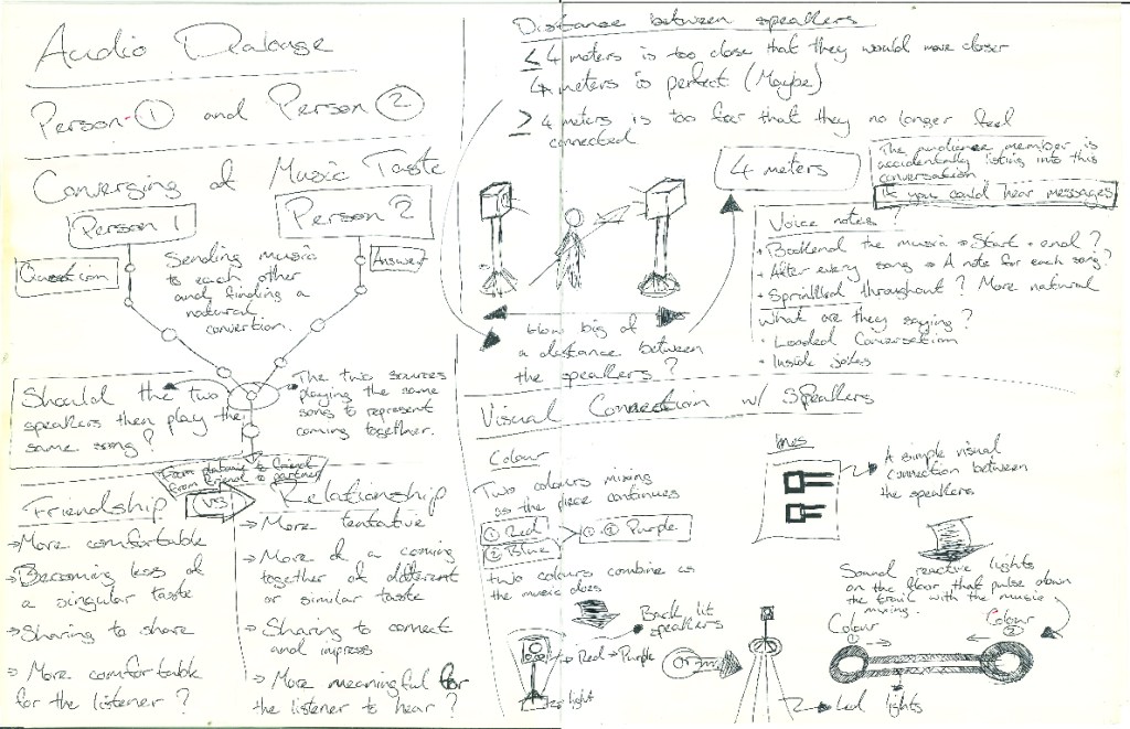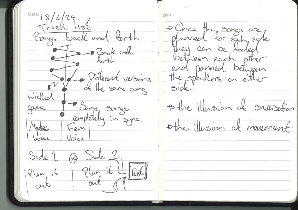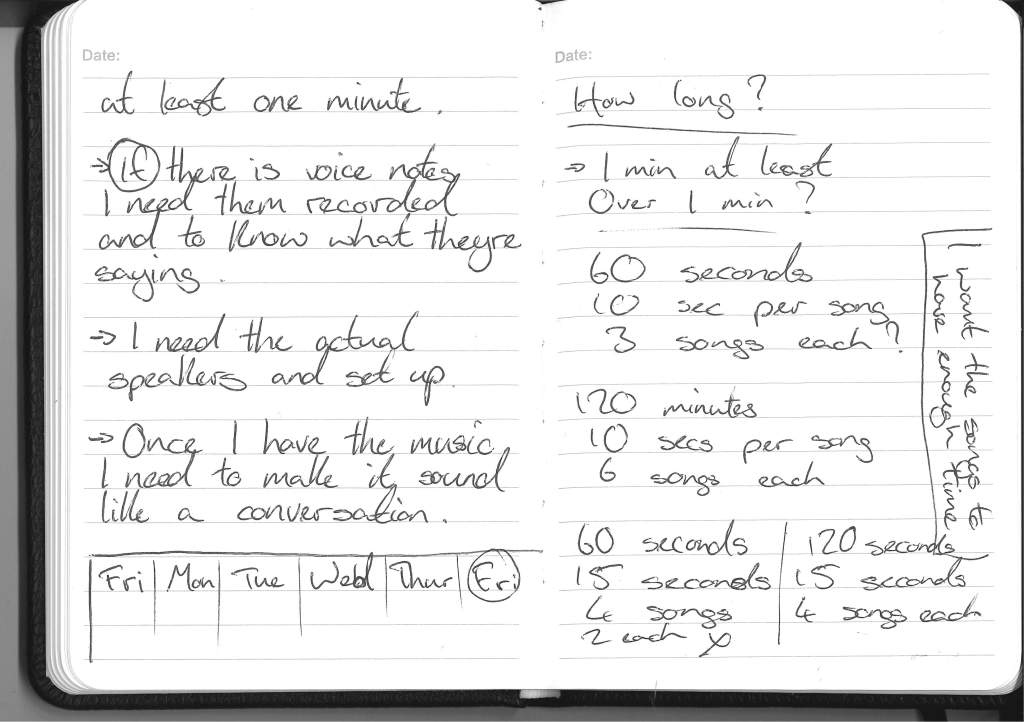 I don’t think I’ll have the full songs in the piece so as not to feel too drawn out. Maybe I’ll just have the song play until the listener has heard enough or when the song feels natural enough that the listener would think of the answering song.