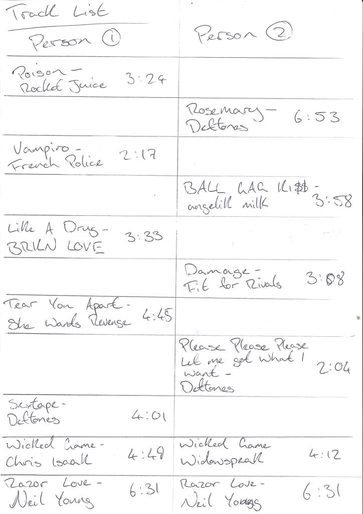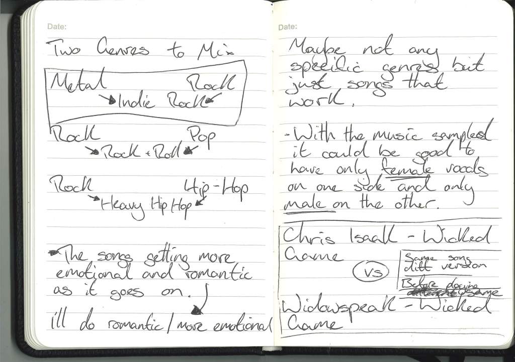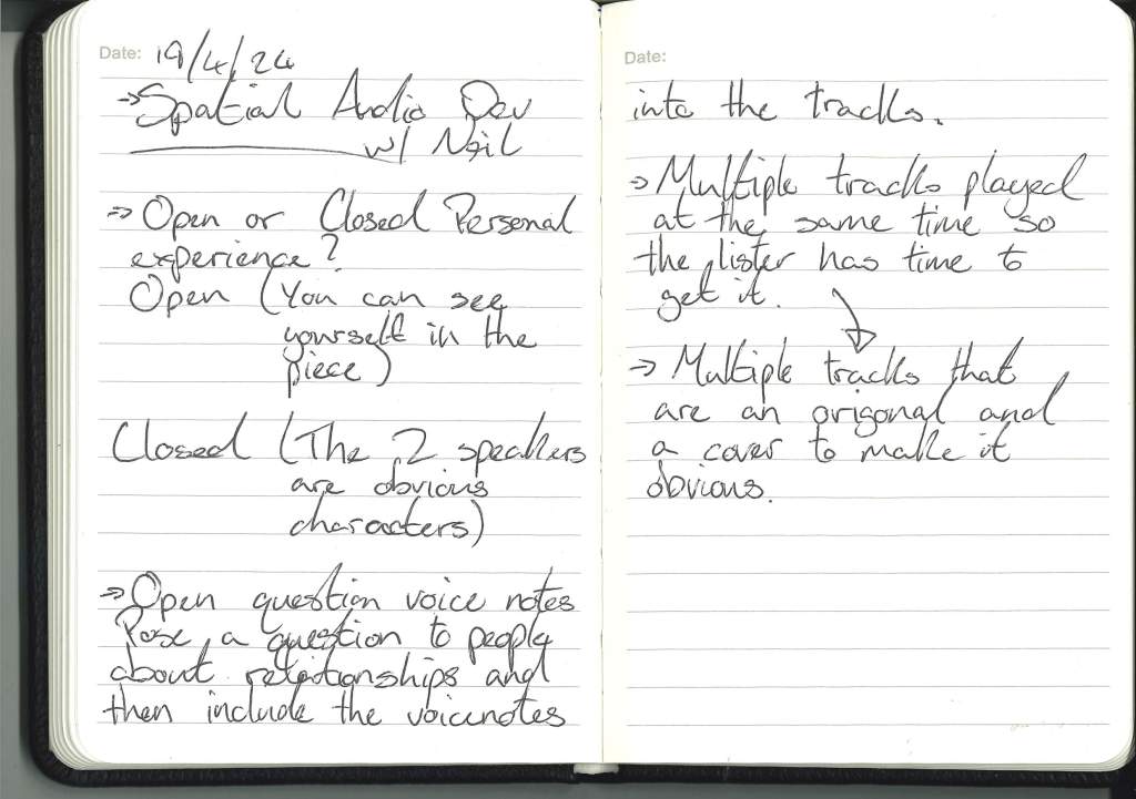 During my conversation with Neil, we discussed the popular trope in music of having a voice note or recording of spoken word or movie dialogue in the track. We discussed how that could be used in my project to make the meaning of the songs more apparent and how voice notes that hint at the story of the relationship can make the connection between the speakers more apparent.