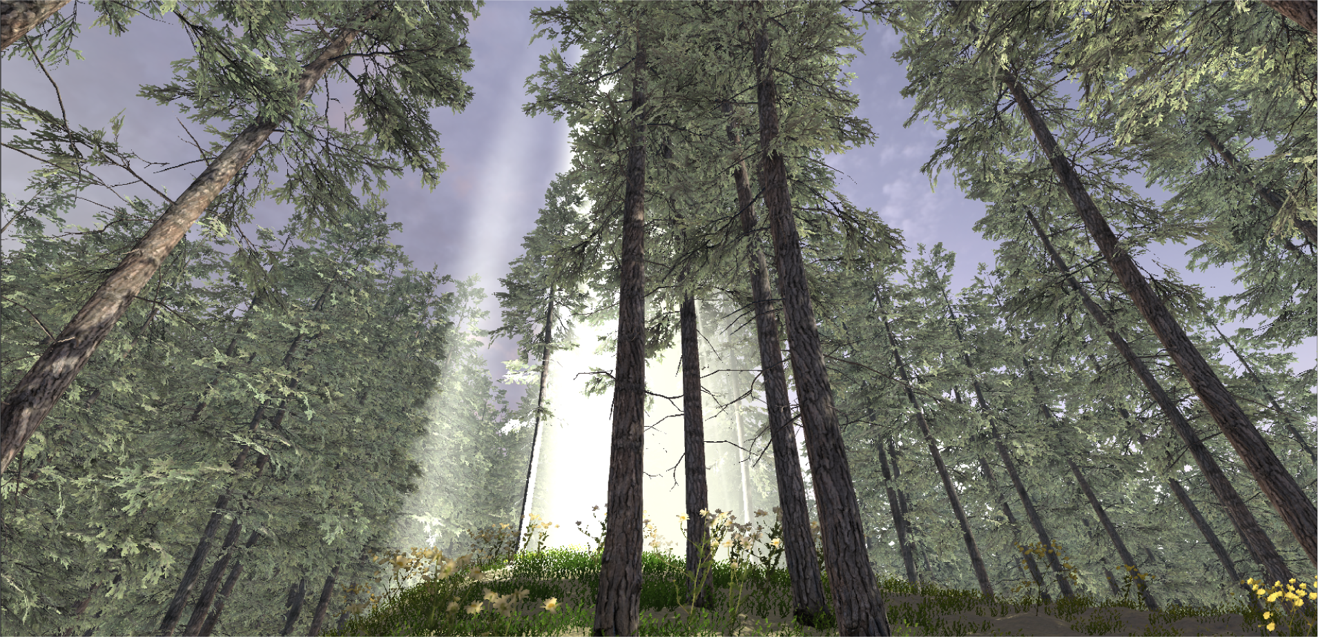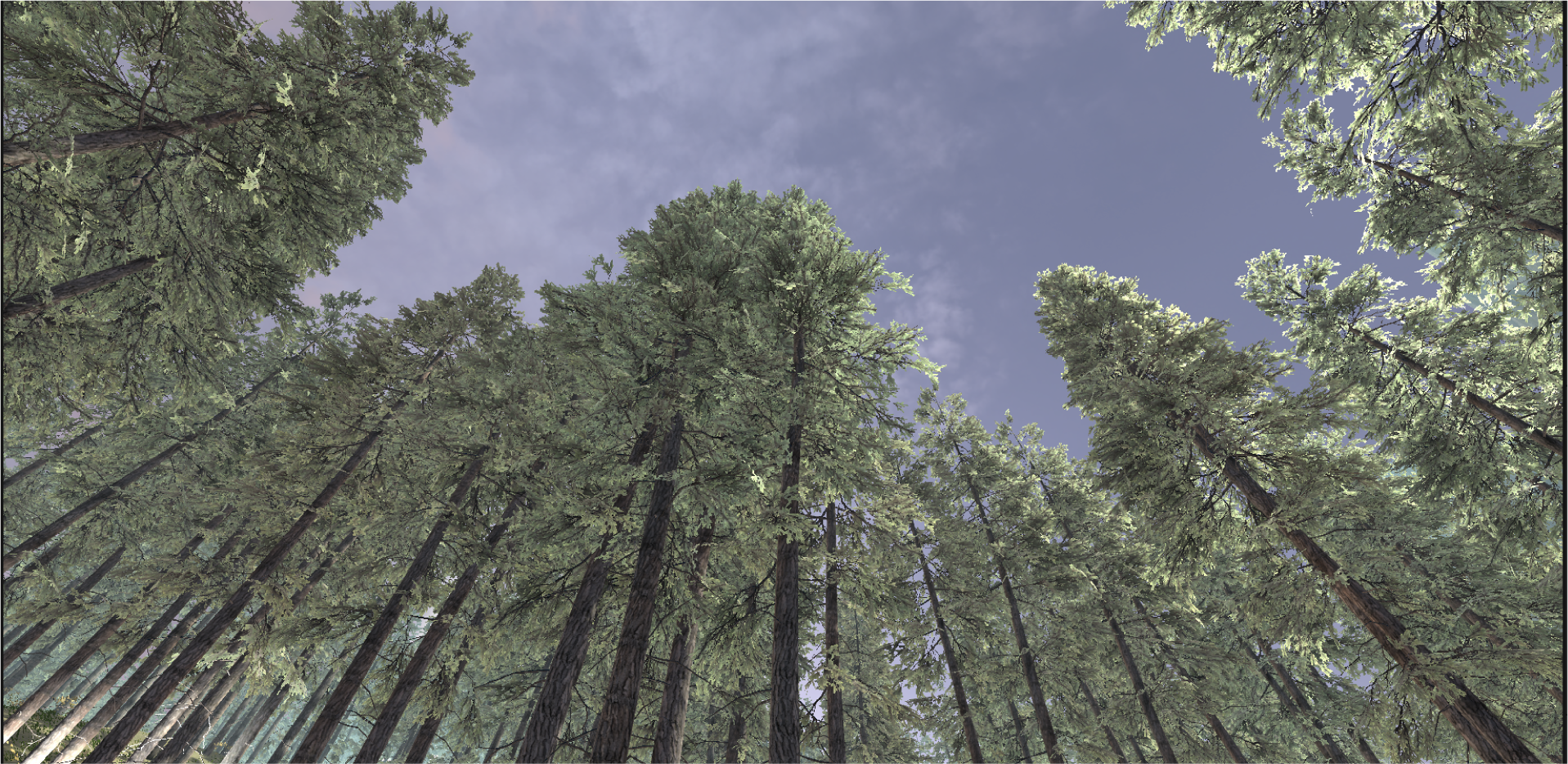 This is my initial test on what trees I should use, how dense they need to be, and how the light reacts through the leaves. After this test, I’ve learned that the trees need to be much denser to achieve the effect I’m after and taller to give the impression of the far-reaching top of the forest.