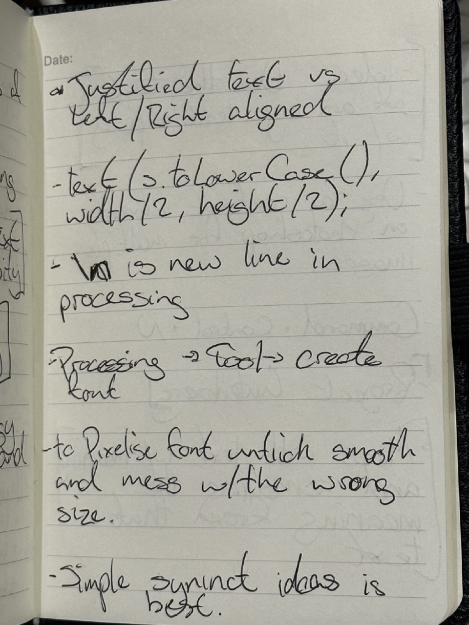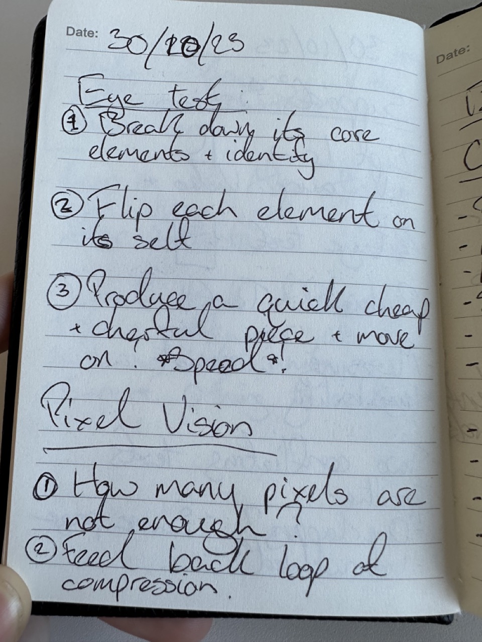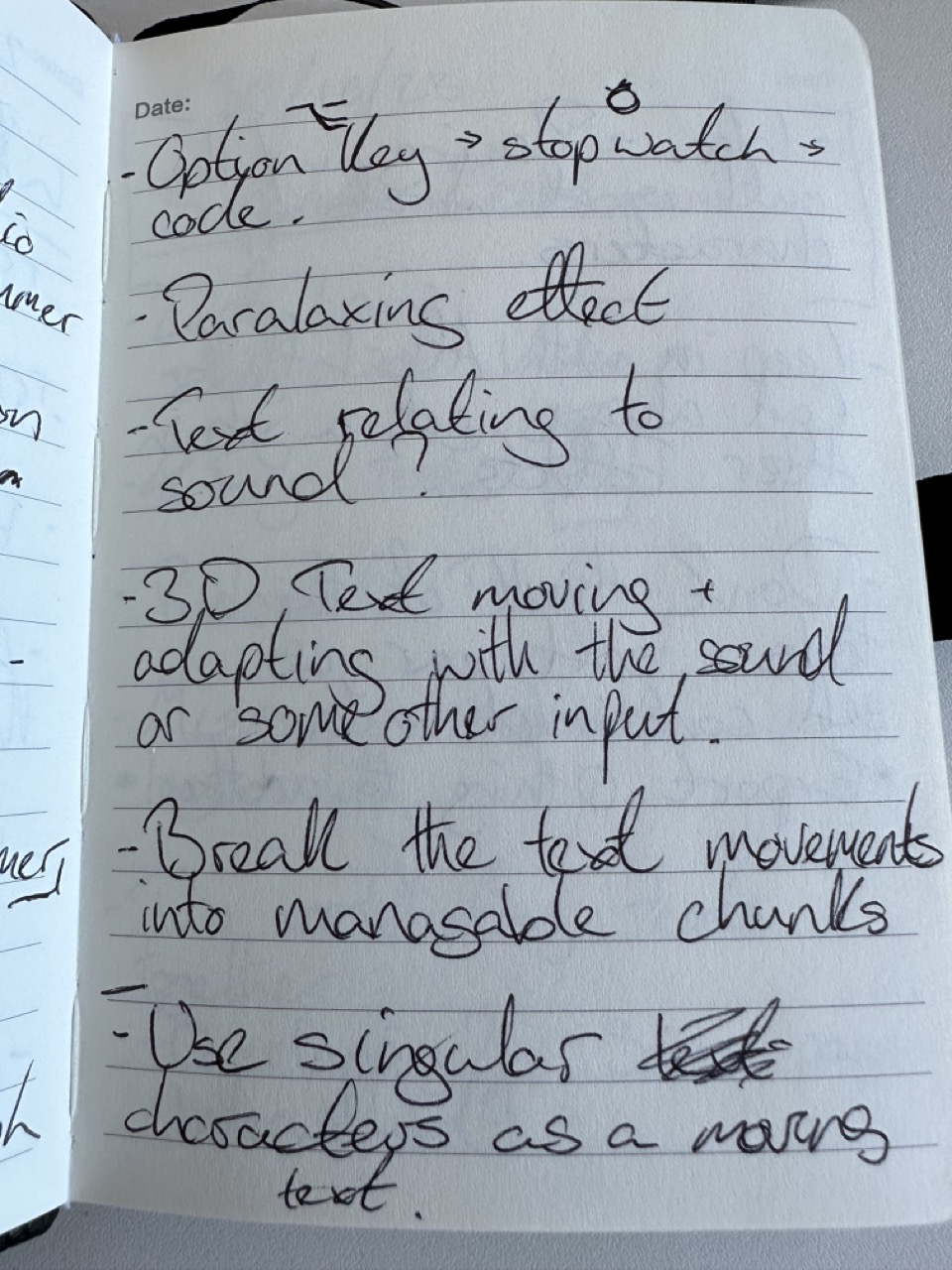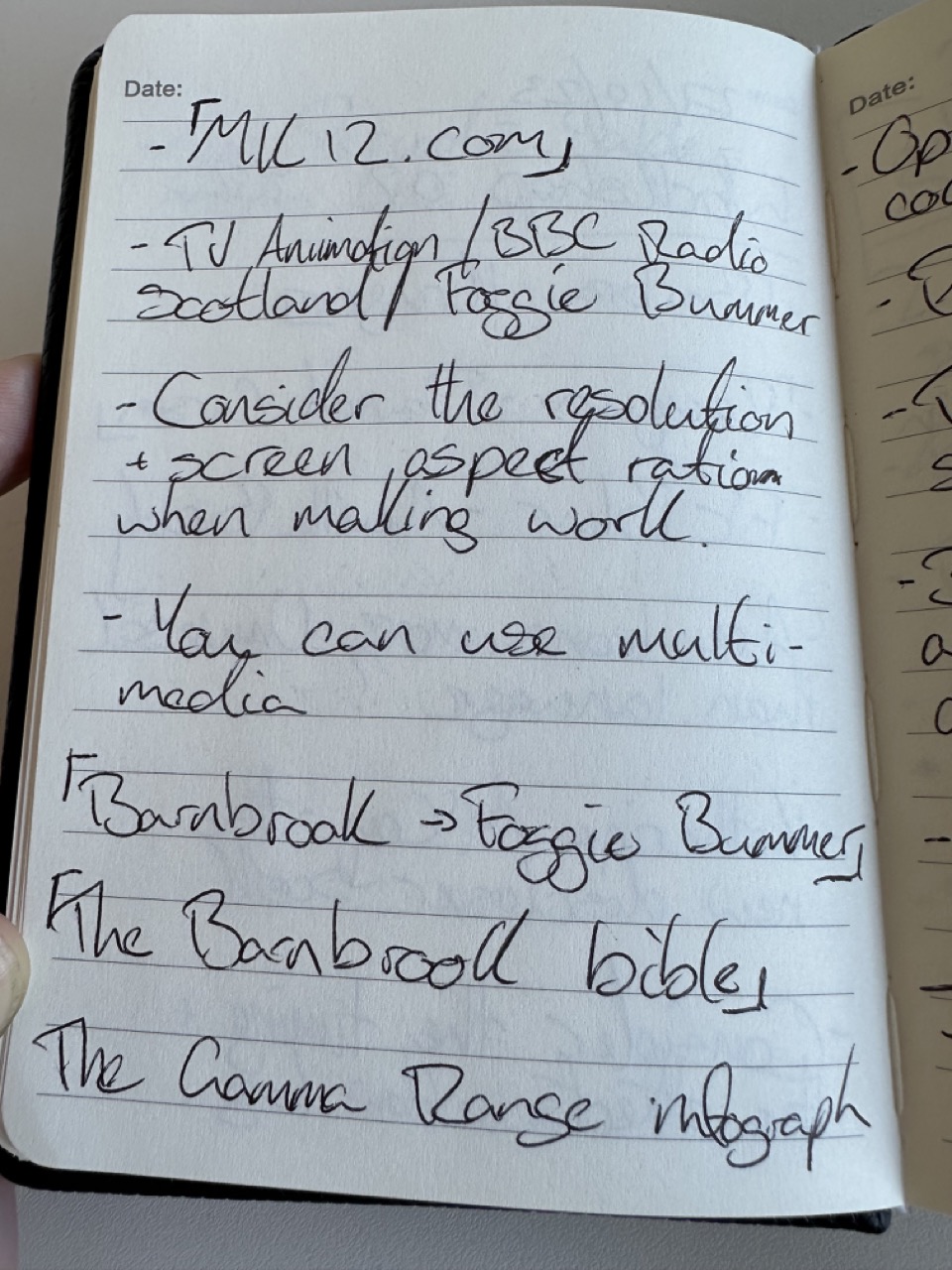 Just a list of things I’ve still to do, keeping me right. There was another stage of this project that I didn’t get to reach in the time available. If I was to revisit this project then I’d give more time these extra features and ideally elevate the work.