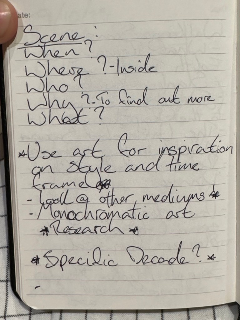 For my scene, I will be doing a linear narrative walking sim with a monochromatic colour scheme; what I now need to figure out is the art style of the scene, the story of the scene and everything that comes along with that.
