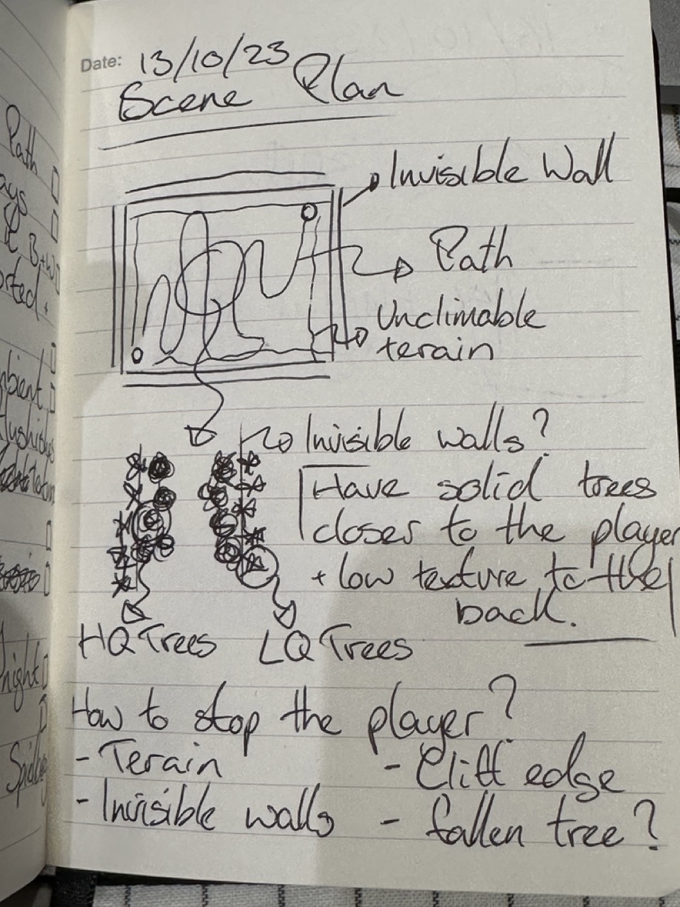 The fold-out pages in my notebook that seem like the scribbles of a madman were actually the XYZ of the sphere triggers and light locations on the terrane.