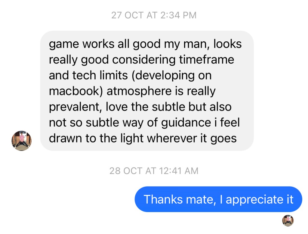 After finishing the scene and building it, I sent it to some of my colleagues and family to get feedback and see if they could find any game-breaking situations or areas. Below is feedback from my course colleague, Stewart.