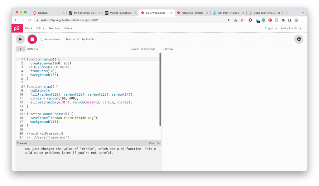 Revisiting the random circles again in my own time but experimenting with different blend modes such as DIFFERENCE, with a monochromatic colour scheme, the rotation aspect from the previous self-study as well as letting it run for different times to see how dramatic the effect got.
