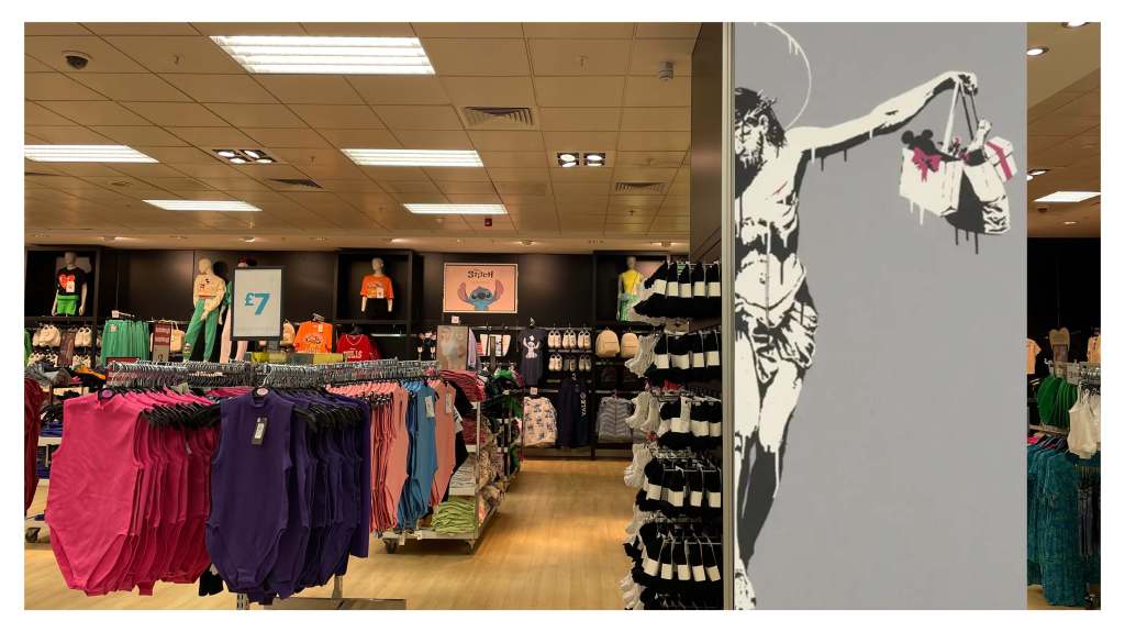 Lifting from recent personal experiences the stark difference between the opulence of royalty and the demand for foodbanks up and down the country came into my head. From position 1 you see the wealth and decadence from the interior of Buckingham Palace and from position 3 you see directions to a foodbank taken from a picture of a neighbourhood wall.